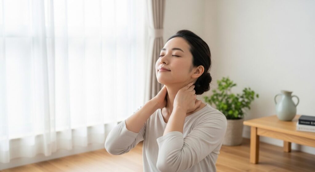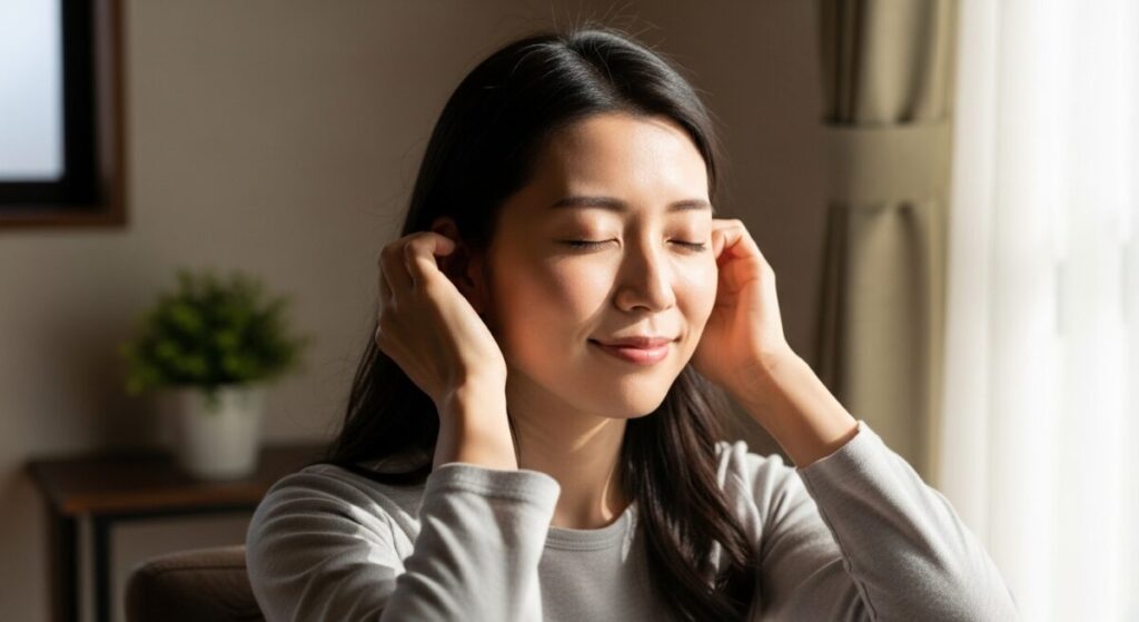 • やり方: 耳の付け根に指を当て、周囲の筋肉をやわらげるように優しくほぐします。